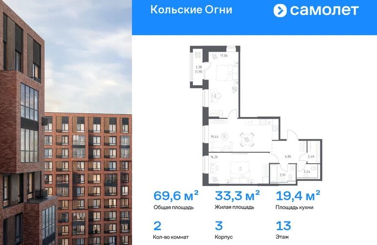 Строим кварталы для жизни с заботой о будущем. Предлагается 2-комнатная квартира комфорт-класса 66,66 кв.м в корпусе 3 на 13 этаже, в ЖК «Кольские Огни» Квартира без отделки. Доступность опции «отделка» и возможность комплектации мебелью и декором уточняйте у застройщика. Приобрести квартиру возможно по специальным акциям от застройщика, с текущими условиями акций можно ознакомиться в блоке «Акций». Цена динамическая и может отличаться, уточняйте актуальность у застройщика. Жилой комплекс «Кольские Огни» будет построен в Мурманской области, в городе Кола. Путь до центра Мурманска будет быстрым — всего 25 минут на машине. Рядом — Поморская набережная, парк, тундровый сад и лес всего в 10 минутах пешком. На первых этажах домов откроются кофейни и магазины, фитнес-зал и салон красоты, аптека, пункты выдачи заказов. Рядом с жилым комплексом работают детский сад, спортивная школа с бассейном и ФОК. Во дворе — озеленение, спортивные площадки, ремонт велосипедов, догхабы. Еще на территории квартала построим паркинг с зарядкой для электромобилей. Корпуса высотой 9–12 этажей и 14–17-этажные башни украшают деревянные панели. На входе в подъезды не будет ступеней и высоких порогов. После прогулки велосипеды и коляски можно оставить в местах хранения. Продуманные планировки от небольших студий до просторных 4-комнатных квартир. Отделка на выбор: готовая, White Box или вариант без нее. Выбирайте варианты без отделки, если хотите реализовать собственные решения.#yan19-2r1807942#О застройщике